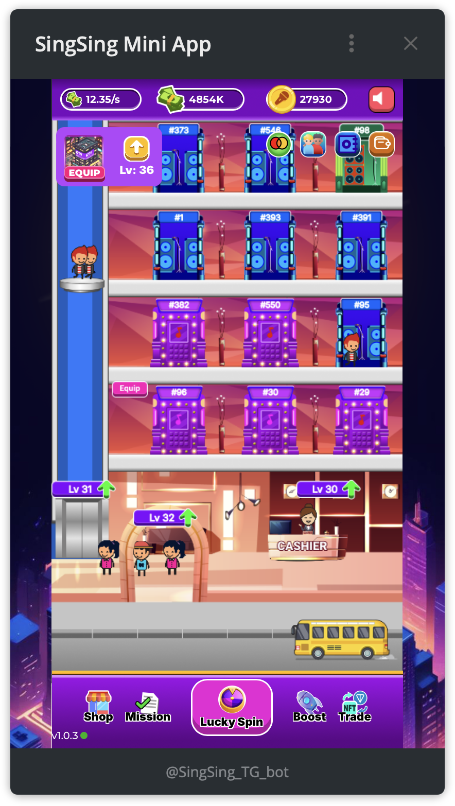 Powered by the TON blockchain, SingSing Tycoon lets you collect, trade, and strategize your way to the top of the charts. Start with a modest karaoke joint and watch it grow into a glittering empire of music and fun!